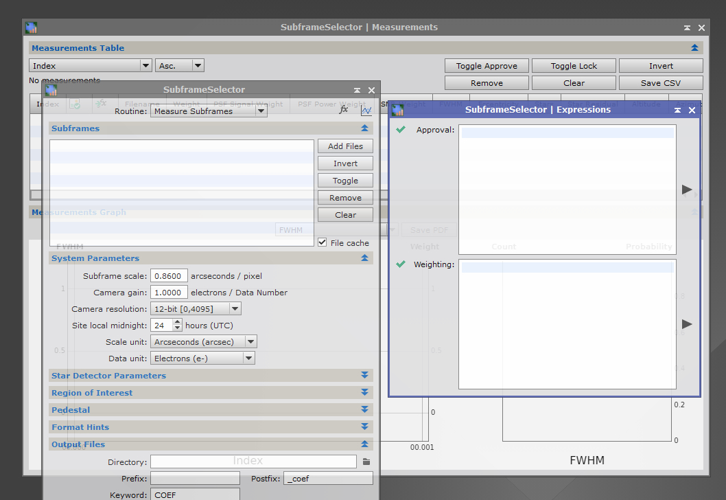 Pour commencer, nous allons analyser nos images et en « mesurer » la qualité. En cliquant sur Analyser les images on lance le process SubframeSelector : celui-ci se compose de 3 fenêtres qui s’affichent alors, SubframeSelector, SubframeSelector Measurements et SubframeSelector Expressions.