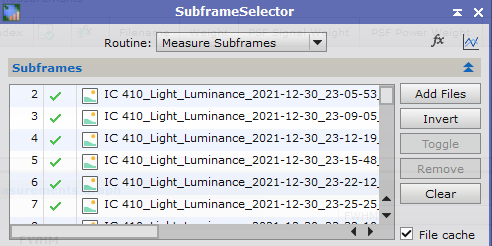 Nous allons tout d’abord entrer toutes nos images de luminance en cliquant sur Add Files dans la fenêtre SubframeSelector, ici j’ai 73 images en luminance de la nébuleuse IC 410.