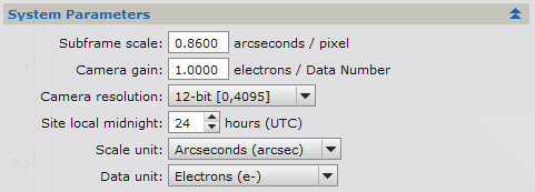 – dans Subframe Scale on entre l’échantillonnage de la caméra utilisée, ici 0,85 arcseconde/pixel dans mon cas. L’échantillonnage E se calcule à l’aide de la formule E = 206 x P/F, formule dans laquelle P représente la taille des pixels de la caméra en microns et F la focale de l’instrument utilisé en mm. Pour l’ASI 1600 la taille des pixels est P=3,80 et j’ai F=920 (la focale du télescope est de 800 mais l’utilisation du Paracorr multiplie la focale par 1,15 ce qui donne une focale résultante de 920). J’ai donc bien E = 206 x 3,8 / 920 = 0,85. La valeur est donc à modifier pour être adaptée à votre setup. Il est à noter que cette valeur ne sera utilisée dans les calculs du process que si l’unité choisie dans Scale Unit est Arcseconds.