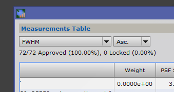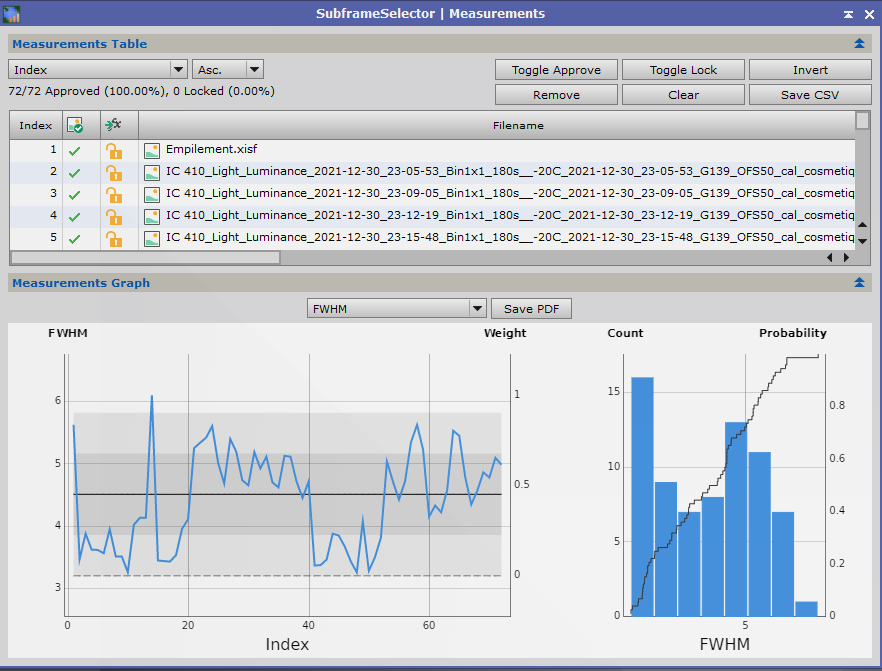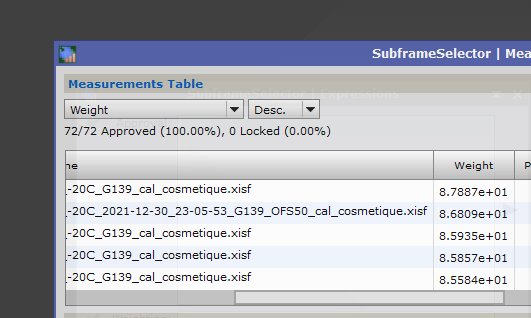 Les résultats de l’analyse des images s’affiche maintenant dans la fenêtre SubframeSelector Measurements :