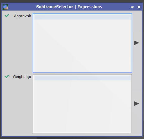 Dans la seconde partie de cette fenêtre, nous allons entrer une formule qui va servir à attribuer un « poids » à chaque image, poids qui sera d’autant plus élevé que les critères de l’image seront de bonne qualité. J’ai intégralement repris la méthode du site Light Vortex Astronomy, décrite ici si vous lisez l’anglais : https://www.lightvortexastronomy.com/tutorial-pre-processing-calibrating-and-stacking-images-in-pixinsight.html#Section5.