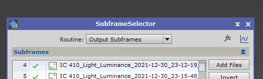 Maintenant on retourne dans la fenêtre Subframe Selector et dans le menu déroulant Routine, on va remplacer Measure Subframes par Output Subframes, pour sauvegarder nos images et leur valeur Weight respectives.