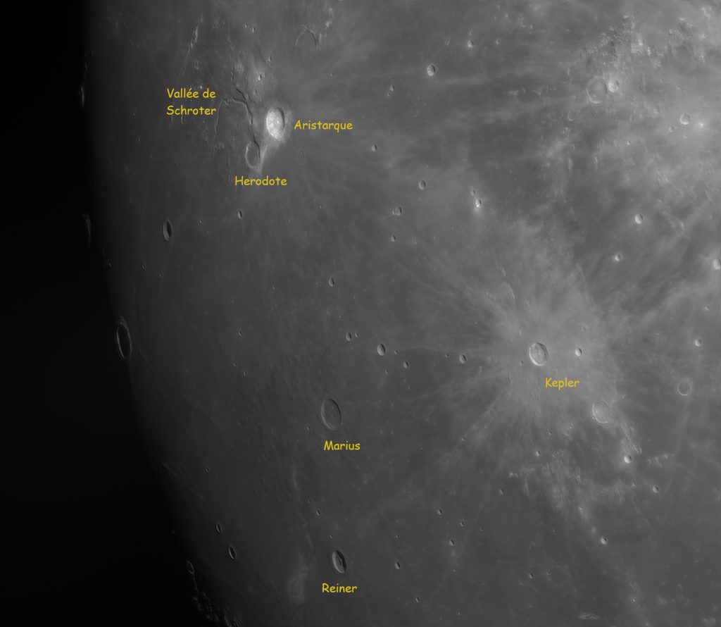La vallée de Schröter est une superbe rainure de 160 km de long, qui rejoint le cratère Hérodote, ce dernier formant un duo remarquable avec un autre cratère, Aristarque. Aristarque, qui mesure seulement 40 km de diamètre, est pourtant très facile à repérer car il est le point le plus brillant de la surface lunaire. C’est un jeune cratère, âgé de « seulement » 500 millions d’années, qui contraste donc avec son voisin Hérodote dont l’apparition est estimé à 4 milliards d’années ! Cette zone forme une région unique sur la Lune, et facile à observer dans de modestes instruments.