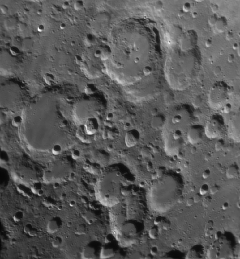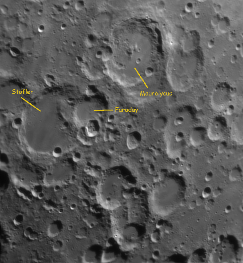 Stöfler est une immense plaine murée de 126 km de diamètre fortement cratérisée. Son fond plat immense est écrasé à l’est par le cratère Faraday. Encore plus à l’est on tombe sur Maurolycus, grande formation de 114 km de diamètre à l’intérieur de laquelle on distingue cratères et montagnes.