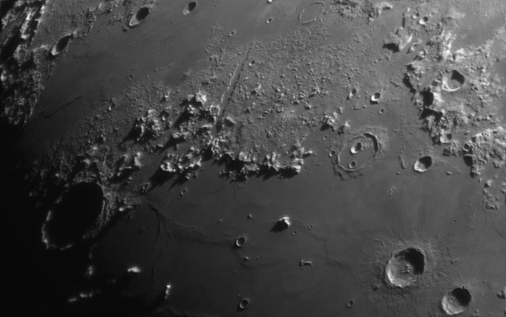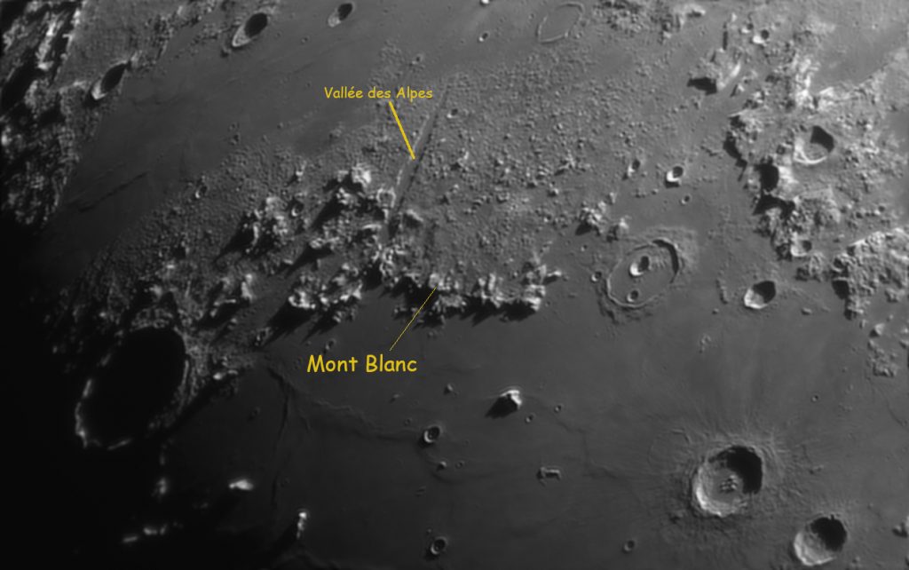 En bordure de la mer des pluies se distingue une belle ouverture effilée, il s’agit de la vallée des Alpes, grande ouverture de 130 km de long. On aperçoit sur la gauche le grand cratère Platon, dans l’ombre. L’endroit est rempli de détails très intéressants et on peut même apercevoir le Mont Blanc !