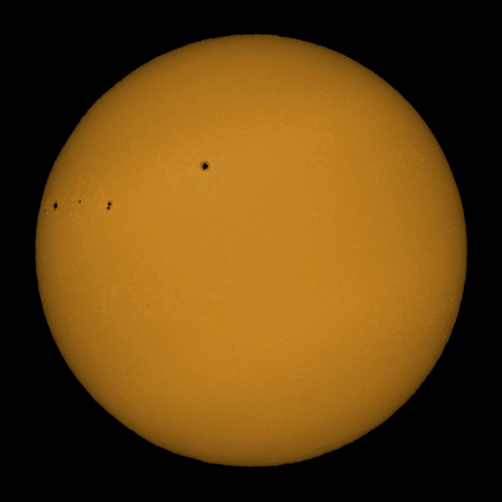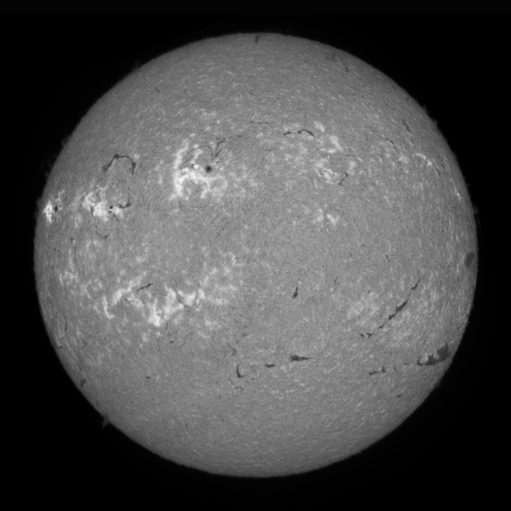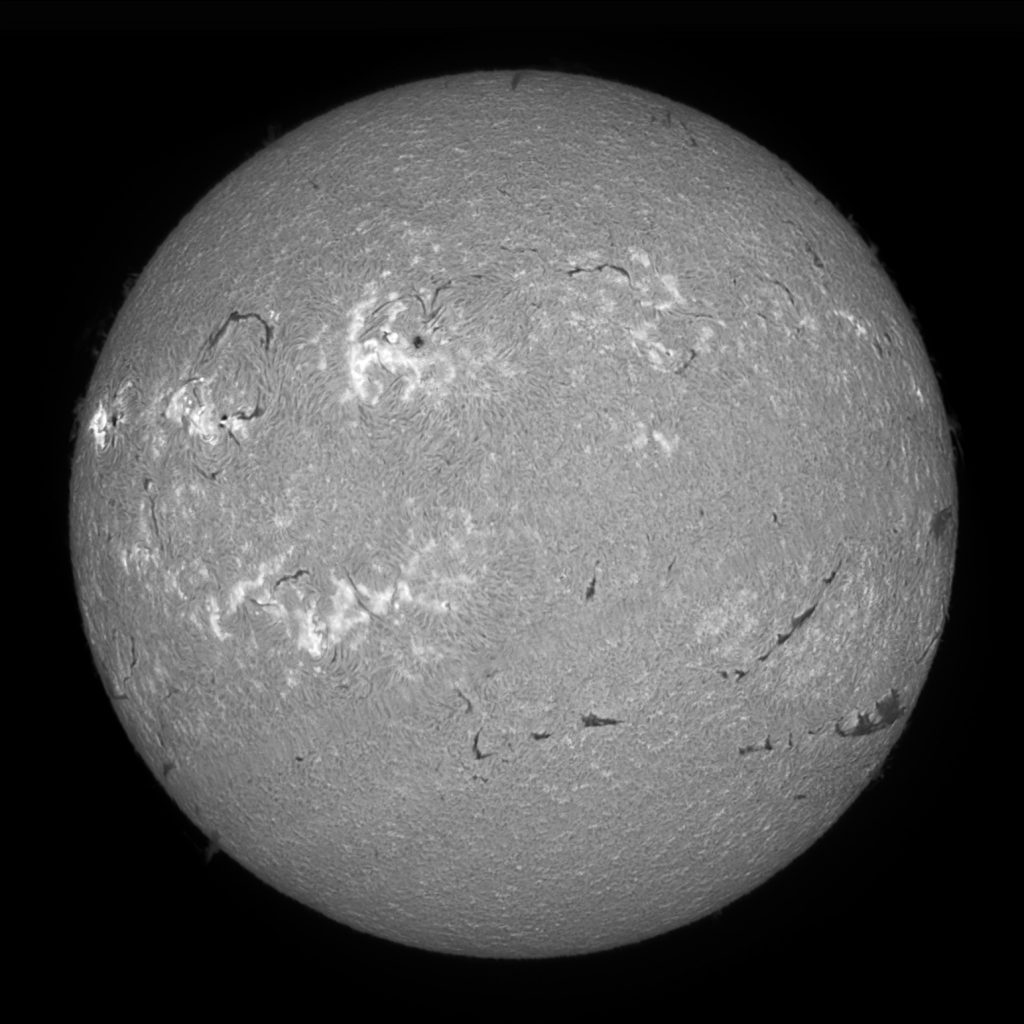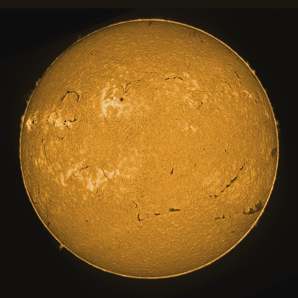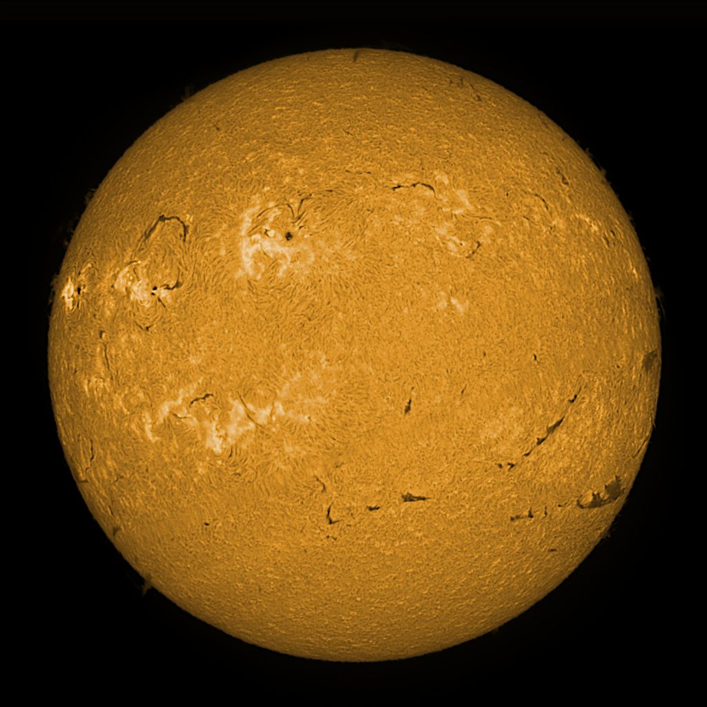 Soleil du 02 mars 2026 Soleil en H-Alpha Image inversée Stacking de 7 images Stacking en couleur Protubérances Protubérances et globe solaire Protubérances en couleur Taches solaires Données techniques : Lunette Skywatcher ED 72/420 avec filtre Hoya ND 1,2 sur EQ6. Sol’ex réglé sur la raie H-Alpha. Filtre H-Alpha 6 nm. Caméra ZWO ASI 178 MM. Capture avec Firecapture. Stacking avec Autostakkert.Colorisation avec Gimp.
