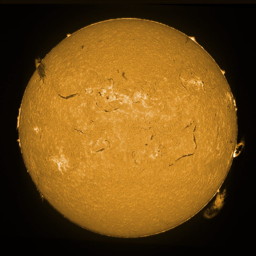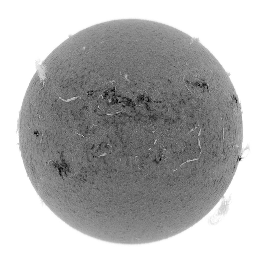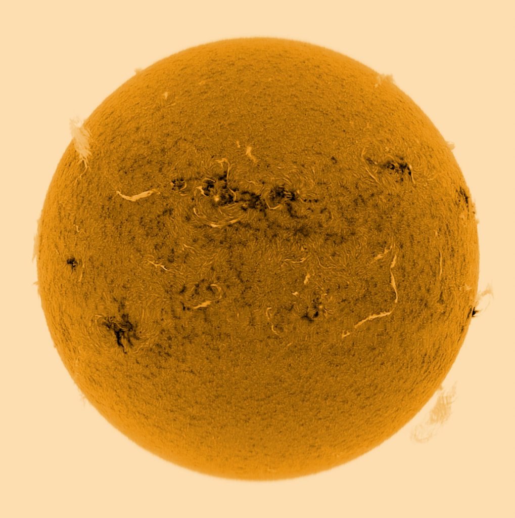 Soleil du 14 juillet 2025 Soleil en H-Alpha Image inversée Image inversée en couleur Stacking de 6 images Stacking en couleur Protubérances Protubérances et globe solaire Protubérances en couleur Taches solaires Données techniques : Lunette Skywatcher ED 72/420 avec filtre Hoya ND 1,2 sur EQ6. Sol’ex réglé sur la raie H-Alpha. Filtre H-Alpha 6 nm. Caméra ZWO ASI 178 MM. Capture avec Firecapture. Stacking avec Autostakkert.Colorisation avec Gimp.