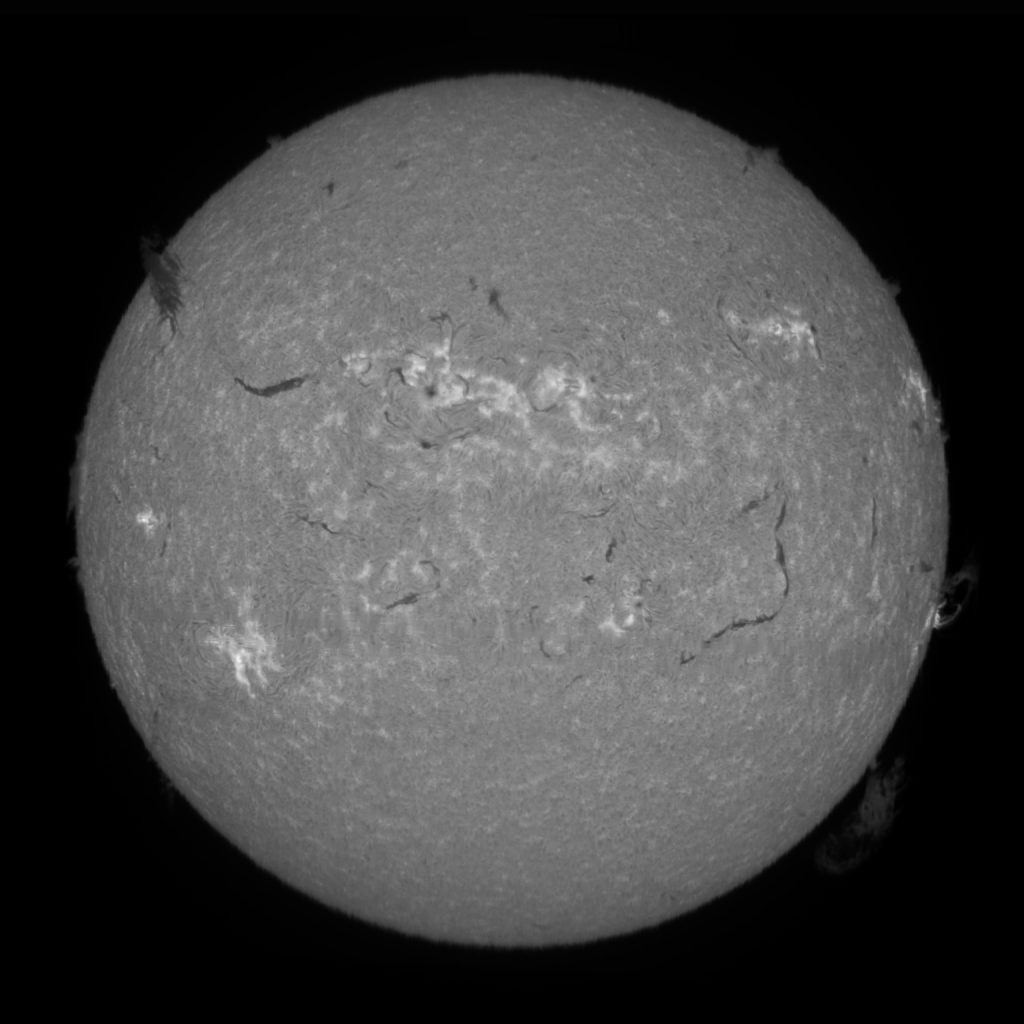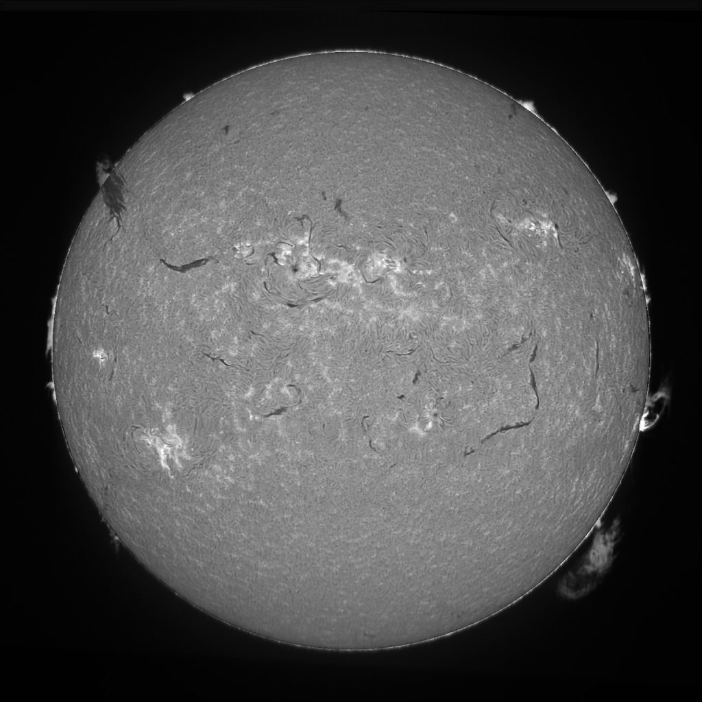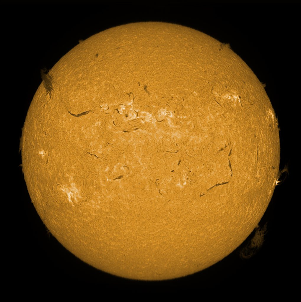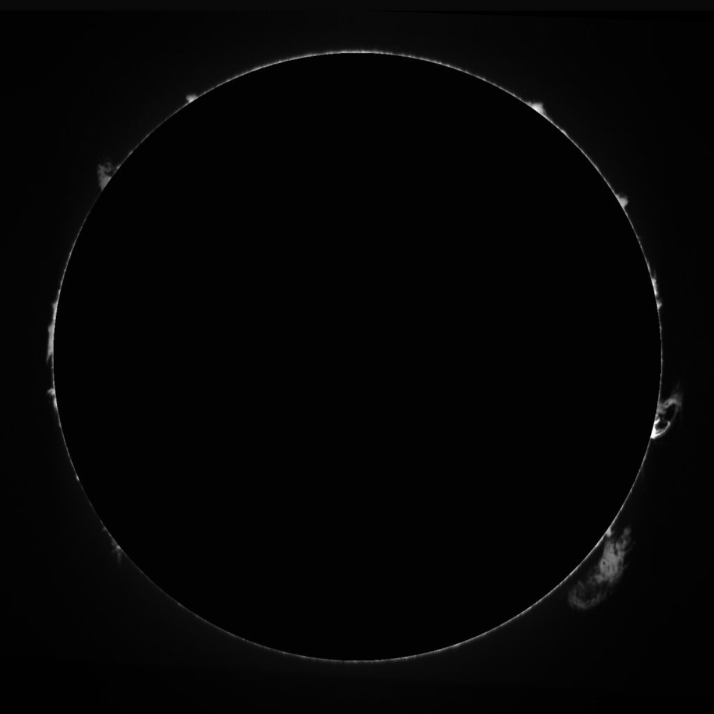 Soleil du 14 juillet 2025 Soleil en H-Alpha Image inversée Image inversée en couleur Stacking de 6 images Stacking en couleur Protubérances Protubérances et globe solaire Protubérances en couleur Taches solaires Données techniques : Lunette Skywatcher ED 72/420 avec filtre Hoya ND 1,2 sur EQ6. Sol’ex réglé sur la raie H-Alpha. Filtre H-Alpha 6 nm. Caméra ZWO ASI 178 MM. Capture avec Firecapture. Stacking avec Autostakkert.Colorisation avec Gimp.